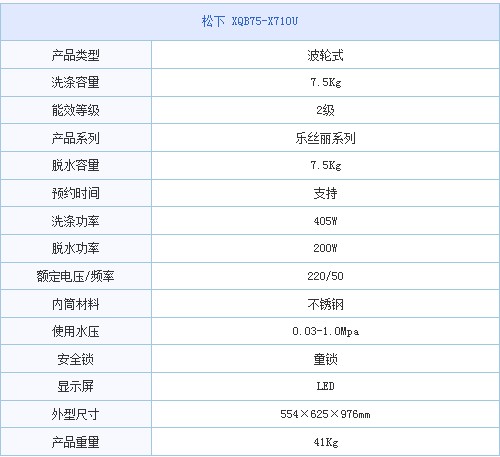 编辑点评:松下波轮式XQB75-X710U 具有的7kg大容量洗涤及独有的离心力洗涤技术,彻底解决波轮式洗衣机衣物洗的不干净等问题。虽然价格上比同类产品偏高,但是技术质量是这款产品关注的重点.